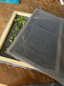 Tot nu toe droogde ik mijn oogst gewoon in platte bakjes met een stukje keukenpapier op een plank in de keuken. Toen er drie bakjes stonden, elk met een flinke stapel kruiden, dacht ik: “Oké, dit kan wel iets professioneler – maar niet zo professioneel dat ik er een fortuin aan kwijt ben.” Dus ben ik online gaan speuren naar goedkope oplossingen om kruiden te drogen.
